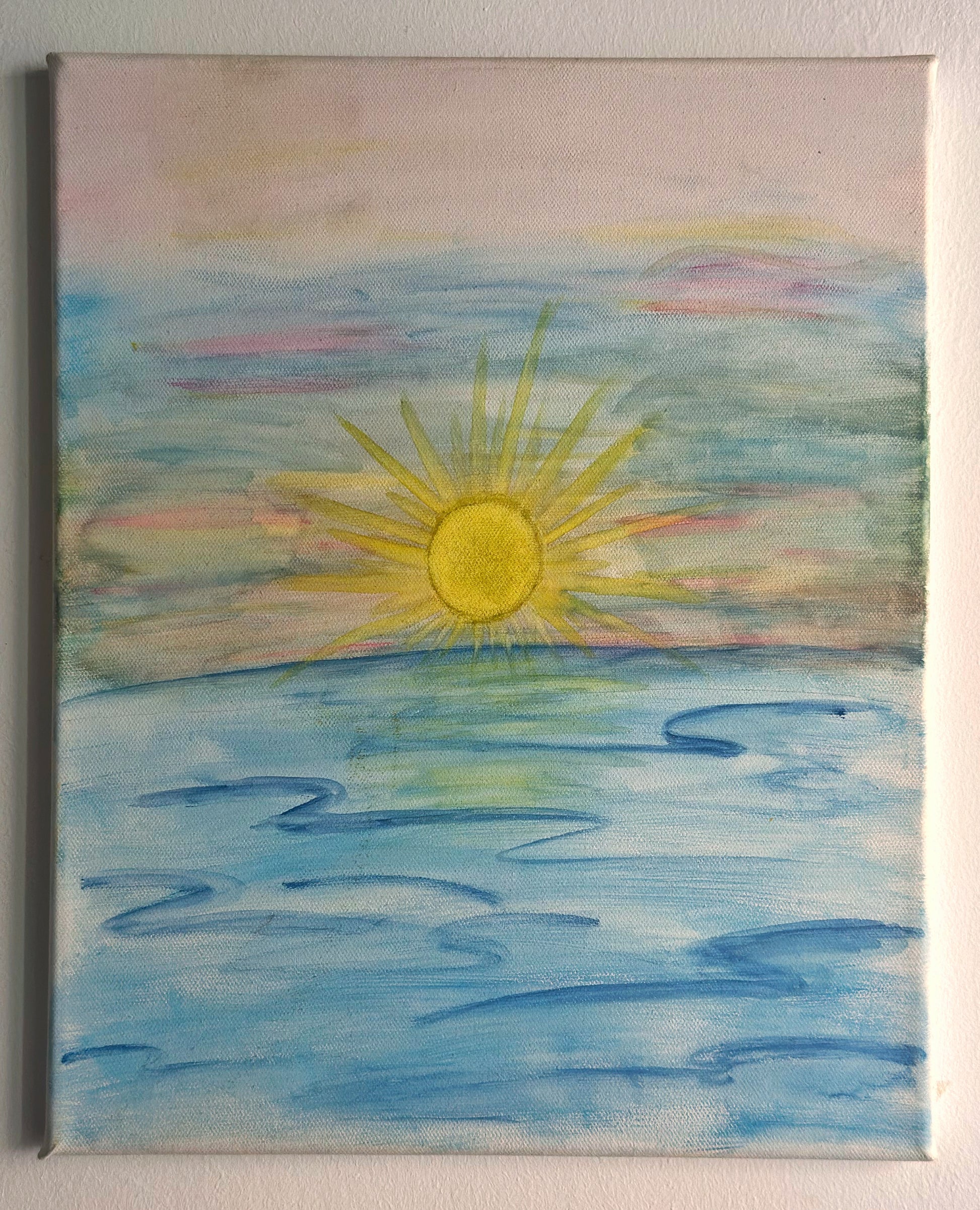 An original work by independent artist Maggie , this painting depicts an intimate sunrise where the sun caresses the horizon in a silent and sacred ritual.