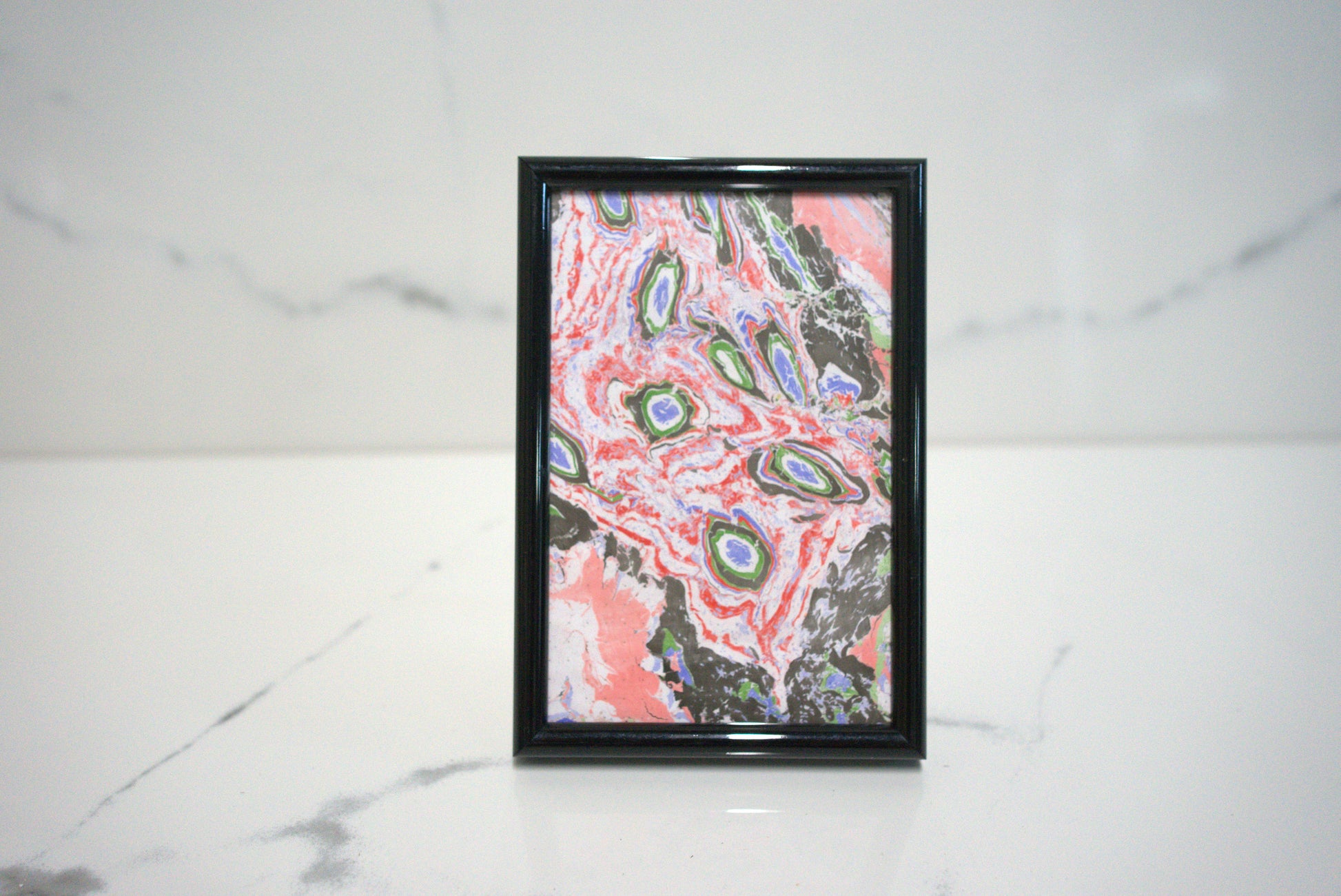 Uma mini obra única na técnica Ebru: ondas de coral e células coloridas, emolduradas, prontas a serem dadas como presente ou colecionadas.